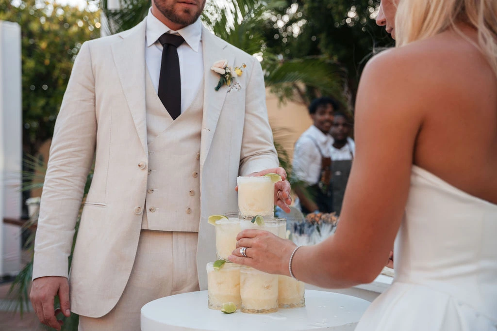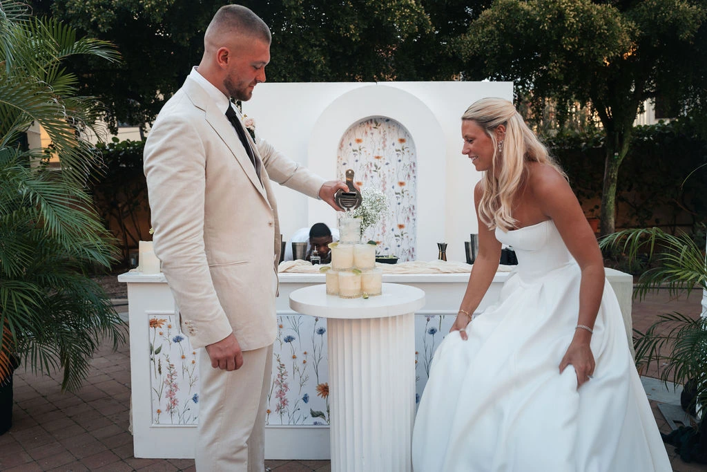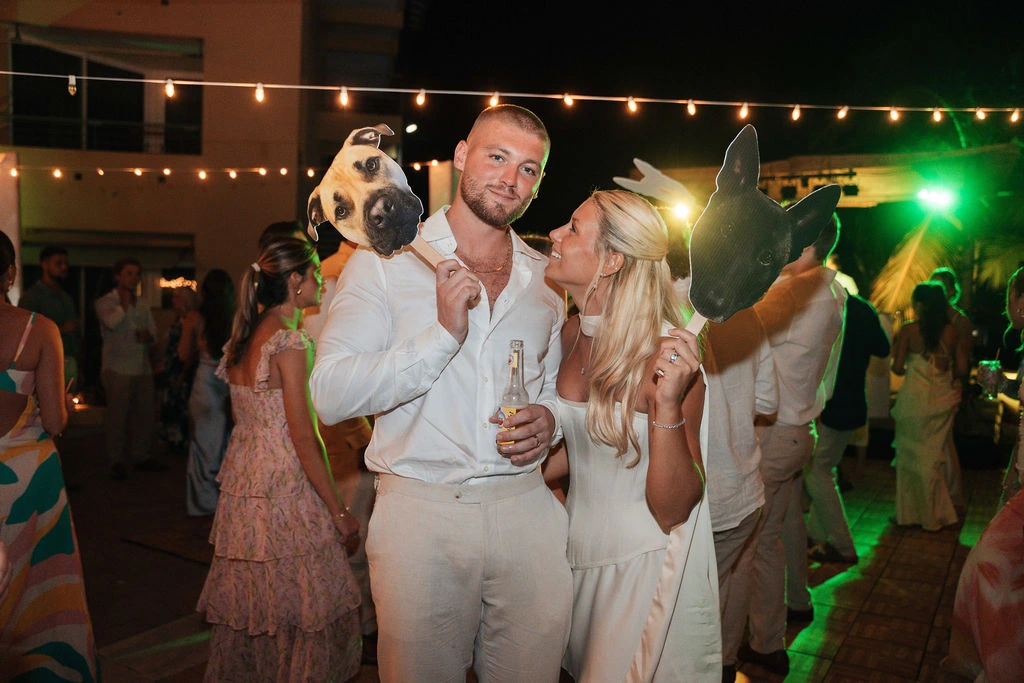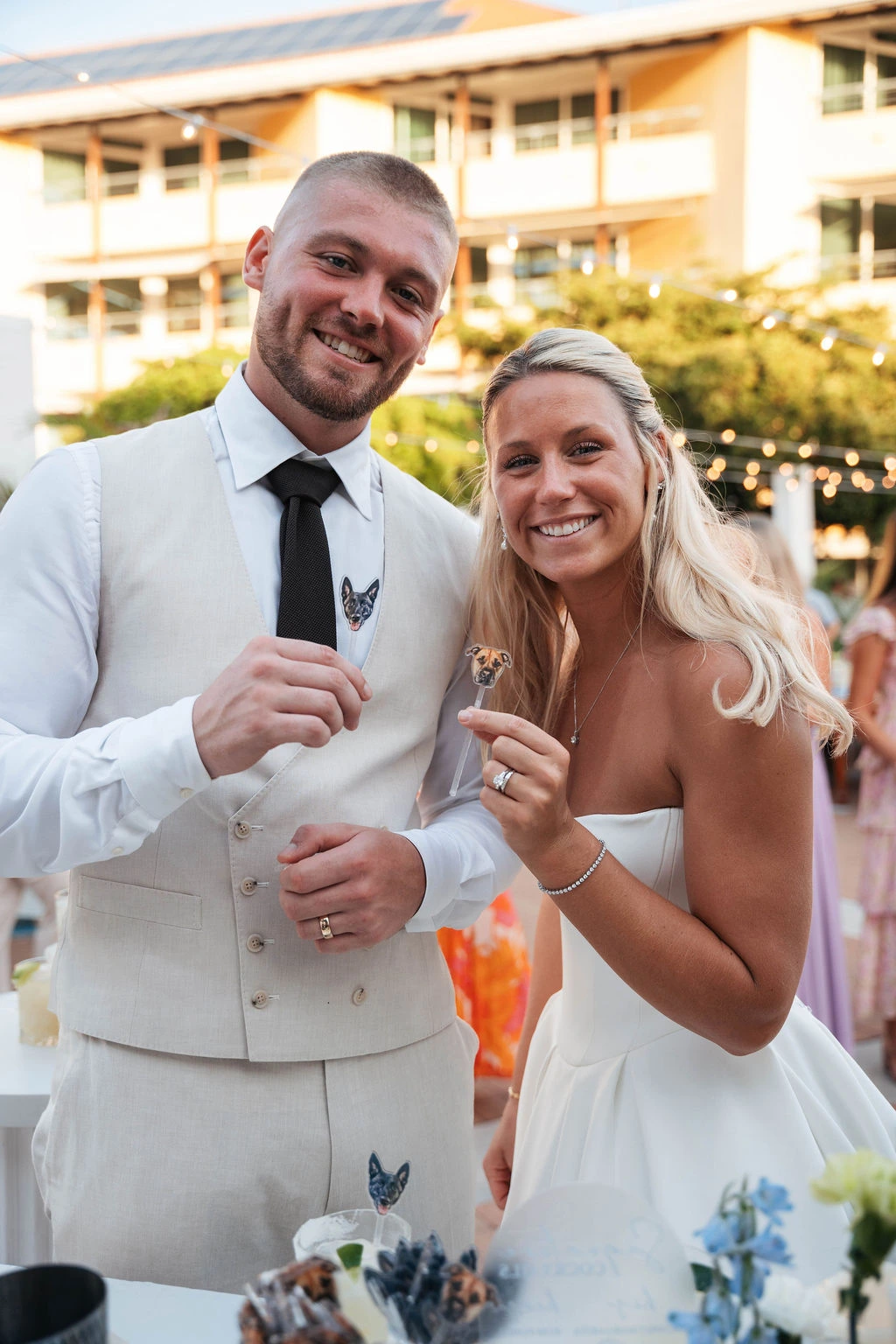 Cailey & Noel also added little elements that made the whole wedding feel unmistakably like them. From tequila shots with the wedding party immediately after the ceremony (the official kick-off) to drink stirrers and dog-head sticks to party with, to signature cocktails like coconut margaritas and rum punch — even down to the funnel Cailey & Noel both drank from. This wedding didn’t just look beautiful. It felt personal, joyful, and completely them.